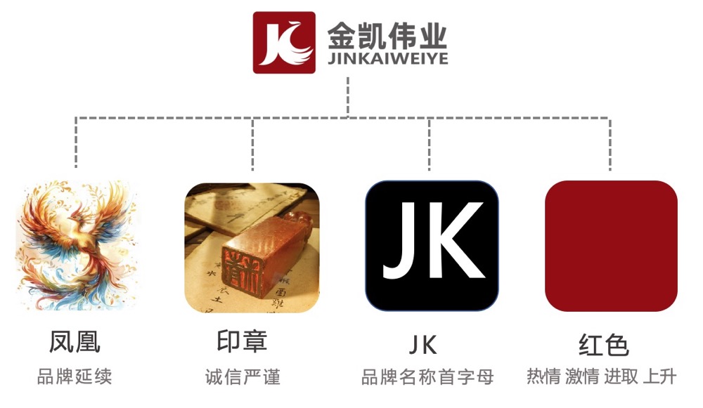 公司品牌標(biāo)志主體元素為金凱拼音首字母“J”“K”,使標(biāo)志更具品牌專(zhuān)屬性和識(shí)別性;同時(shí)將鳳凰進(jìn)行抽象、概括的藝術(shù)化處理,融入“J”“K”中。
