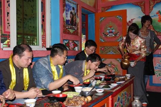 來到九寨不體驗一下少數(shù)民族的風俗文化可不是一個明智的選擇,我們可是不枉此行,參加了具有濃郁藏家風情的藏家烤羊晚會,美食加美酒,還有豐富的民族節(jié)目表演,之后還參加了當?shù)氐捏艋鹜頃瑲g聲笑語不斷。