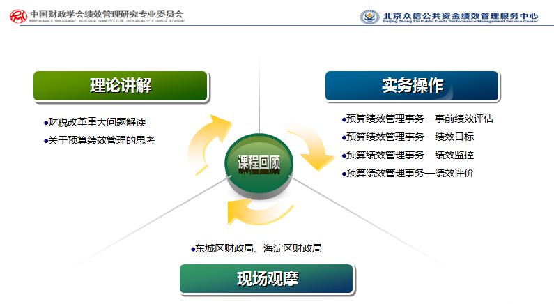 本期培訓(xùn)從培訓(xùn)方案來看“內(nèi)容充實”,既是專業(yè)技術(shù)研討和經(jīng)驗交流會,又是預(yù)算績效管理體驗式學(xué)習(xí)活動;從培訓(xùn)日程上看“獲得感強”,培訓(xùn)內(nèi)容方面,從新預(yù)算法視角下的財政管理新形式、新常態(tài),到基于財政管理視角的預(yù)算績效管理周期理論;培訓(xùn)方式方面,有形勢解讀、信息發(fā)布,具體的方式有課堂教學(xué)、現(xiàn)場觀摩、互動交流、命題匯報、集中研討、課后考核等;培訓(xùn)時間方面,計劃學(xué)時24學(xué)時,但有效時長超過30學(xué)時;從教學(xué)管理上看,課程設(shè)置方面,基礎(chǔ)理論與實踐操作規(guī)程相結(jié)合;教學(xué)方式方面,課程講授與現(xiàn)場觀摩相結(jié)合;師資配備方面,領(lǐng)域資深學(xué)者與實務(wù)操作精英相合;成果展示方面,書面測試與命題匯報相結(jié)合。