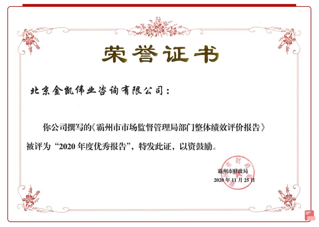 為激勵先進、表彰優(yōu)秀,霸州市財政局于2020年12月7日舉行表彰獎勵儀式,為在本年度預算績效管理工作中表現(xiàn)優(yōu)異的第三方機構(gòu)頒發(fā)榮譽證書。我公司連續(xù)第二年被霸州市財政局評為優(yōu)秀第三方機構(gòu),其中《霸州市市場監(jiān)督管理局部門整體績效評價報告》和《2019年住建局日常綠化養(yǎng)護、維護經(jīng)費績效評價報告》2篇報告被評為優(yōu)秀報告。對霸州市財政局給予的支持和鼓勵我們表示由衷的感謝!