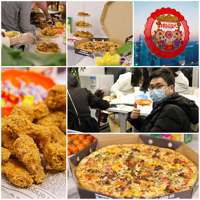 會后,公司為小伙伴兒們準備了豐盛的晚餐,超大尺寸的披薩、可口的甜甜圈、奶香的泡芙,大家品嘗著美食,分享著趣事,暢談著未來......