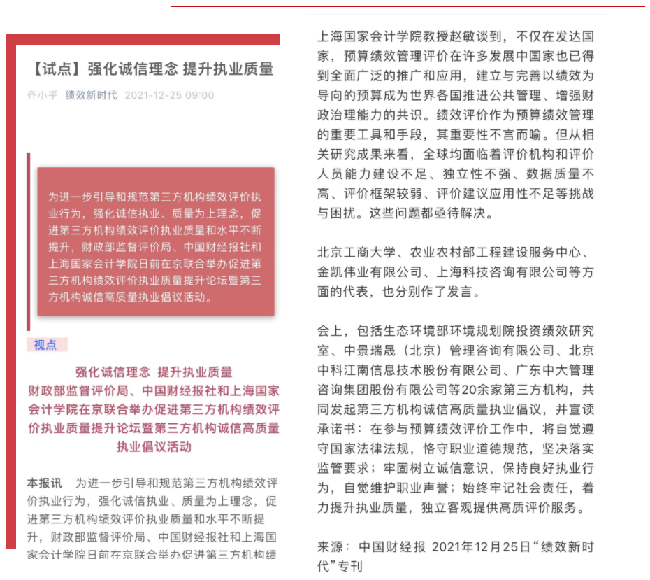 作為績效服務領域的“老兵”,我們感謝各級政府部門對行業(yè)的大力支持,同時,也倡導各位同仁,按照文件要求,努力凝聚精神內核,提升自身素質,強化質量意識、責任意識、誠信意識,助力我國預算績效管理改革的步伐,向更深層次邁進。