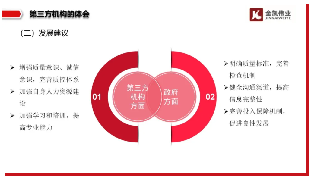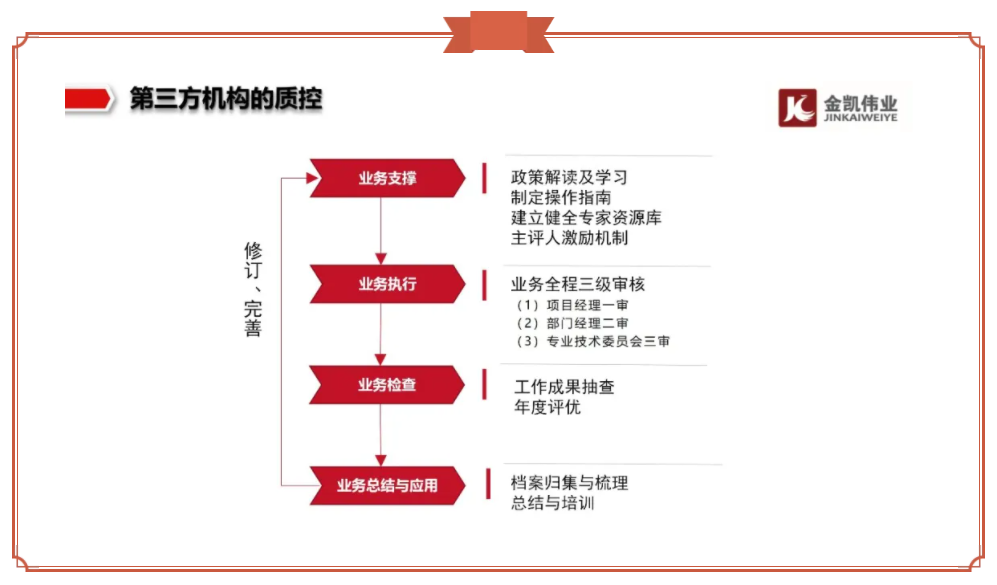 第三方機構認真執(zhí)行相關規(guī)定,自身質量控制能力在不斷增強。以金凱為例,作為第三方機構,我們始終堅信質量是立足的根本。目前,我們已經形成包括業(yè)務支撐階段、執(zhí)行階段、檢查階段和總結應用階段全過程全鏈條的質控閉環(huán)管理機制,將具有針對性的管理工具和方式覆蓋各階段,切實保障工作質量和執(zhí)業(yè)水平。