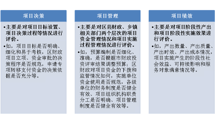 根據(jù)項目特點(diǎn)及內(nèi)容,從項目決策、項目管理和項目績效三個方面明確項目A的評價重點(diǎn)。其中:項目決策方面,主要對項目目標(biāo)設(shè)置、項目決策過程等情況進(jìn)行評價;項目管理方面,主要對區(qū)縣和鄉(xiāng)鎮(zhèn)兩個層次的項目資金管理情況和項目實(shí)施過程管理情況進(jìn)行評價;項目績效方面,主要是對項目產(chǎn)出和實(shí)施效果進(jìn)行評價。具體內(nèi)容如下圖。