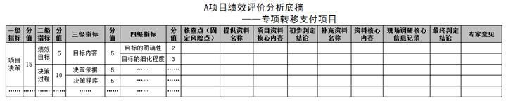 為及時記錄項目進(jìn)展情況,在工作過程中,我們制定了與指標(biāo)體系相對應(yīng)的專項轉(zhuǎn)移支付項目績效評價分析底稿,記錄項目相關(guān)核心內(nèi)容,便于對項目整體情況進(jìn)行把握。具體工作分析底稿樣表如下。