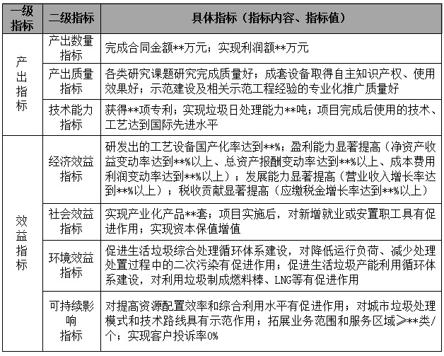 通過研發(fā)具有高科技含量和高附加值的關(guān)鍵技術(shù)與設(shè)備產(chǎn)品,為A市生活垃圾綜合處理提供示范樣板工程,帶動相關(guān)工程、設(shè)計、設(shè)備加工等產(chǎn)業(yè)發(fā)展;通過充分利用垃圾產(chǎn)能,實現(xiàn)能量自給自足;通過二次污染控制技術(shù)和產(chǎn)品應(yīng)用,有效提高居民生活環(huán)境。具體個性績效指標(biāo)詳見表1。